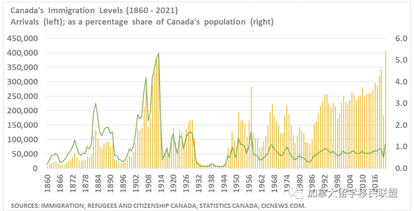 2015 年,加拿大每年接待约 250,000 名移民。2016 年,它宣布了每年 300,000 名新移民的新基线目标。在新冠爆发之前,移民配额每年约为 34 万,但由于新冠影响,2020 年新移民人数降至20 万以下。加拿大政府随后于 2020 年 10 月宣布,它将期待每年欢迎超过 40 万移民向前推进,以帮助支持其后 COVID-19的 经济复苏。这是加拿大历史上最高的目标。去年,加拿大打破了新移民记录,新增了 405,000 名永久居民,其中大部分是通过将加拿大境内的申请人转为永久居民。在新冠之前,大多数新移民从国外抵达加拿大。加拿大以高水平的新移民为目标,以支持其经济和财政状况。由于人口老龄化和低出生率,加拿大需要更高水平的移民来支持其人口、劳动力和经济增长,以及有足够的工人来支付必要的税收来支持重要的社会服务,例如医疗保健和教育。加拿大还追求社会移民目标,包括家庭团聚、提供人道主义援助和加强其法语传统。在新冠大流行期间,移民可以说具有更大的经济重要性。由于大流行和经济活动疲软导致支出增加,加拿大各国政府都出现财政赤字。此外,由于加拿大人口老龄化、COVID 期间经济发生重大变化以及来自海外的移民减少,加拿大各地的雇主都面临劳动力短缺的问题。