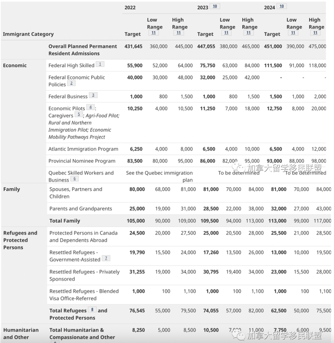 省提名计划(PNP)将成为经济类移民的主要招生计划,加拿大移民、难民和公民部(IRCC)希望在 2022 年通过 PNP 登陆 83,500 名新移民。IRCC 今年已将快速通道EE项目的邀请人数减少了一半,只有55900个配额,但目标是到 2024 年恢复到正常的快速通道( Express Entry)邀请水平,届时将有111,500 名EE配额。该计划似乎表明, IRCC 正在暂时减少 Express Entry 的配额,以便它可以转移到 TR2PR 计划下。IRCC 计划2022 年在TR2PR项目中接受40,000 名移民,到 2023 年在 TR2PR 项目中接受 32,000 名移民。与此同时,Express Entry 抽签继续每两周进行一次,目前还是只邀请PNP类别申请人。到 2022 年,家庭类将占移民目标的 24%,其中 80,000 人将通过配偶、伴侣和子女类别获得身份,25,000 人将通过父母和祖父母计划 (PGP) 获得身份。与之前的计划相比,IRCC 略微提高了其 PGP 的移民配额,增加了 1,500 个名额。其余 20% 的移民将通过难民和人道主义计划抵达。与加拿大上一个移民水平计划相比,这增加了约 5 个百分点,这可能是加拿大希望在未来几年重新安置 40,000 名阿富汗难民的一个功能。2022年 431,645人; 2023年 447,055人 ; 2023年 451,000人